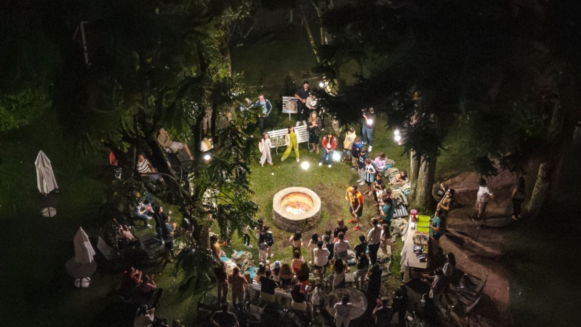 Uma sessão de filmes muito divertida no jardim do hotel.